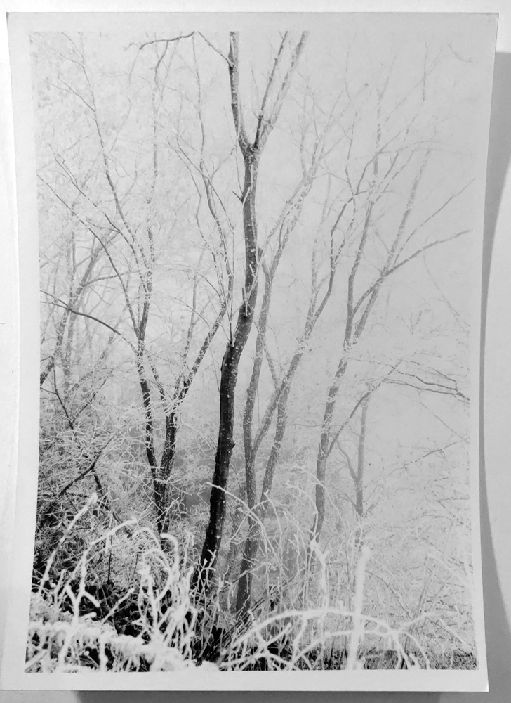Hier kommt Splitgrade ins Spiel. Nämlich dass man dieses Geäst oben nicht mit #3.5 "normal" nachbelichtet, was das Verhältnis (8,32), also (1,4) nahelegt, sondern mit #5 "extra-hart" bzw. mit reinem blauem Licht. Diese Belichtung steuert nur die Schatten, nicht die Lichter, die ruhig weiter funkeln dürfen. Lichtgefüllter Nebel darf von glitzerndem Rauhreif durchdrungen sein. Das gewichtet das Bild aus, zwischen oben und unten. Ich nehme 8s, das sind 1/3 EV mehr.
