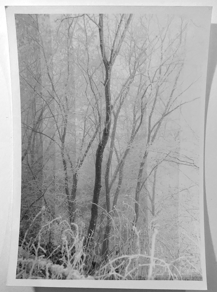 Hier kommt Splitgrade ins Spiel. Nämlich dass man dieses Geäst oben nicht mit #3.5 "normal" nachbelichtet, was das Verhältnis (8,32), also (1,4) nahelegt, sondern mit #5 "extra-hart" bzw. mit reinem blauem Licht. Diese Belichtung steuert nur die Schatten, nicht die Lichter, die ruhig weiter funkeln dürfen. Lichtgefüllter Nebel darf von glitzerndem Rauhreif durchdrungen sein. Das gewichtet das Bild aus, zwischen oben und unten. Ich nehme 8s, das sind 1/3 EV mehr.